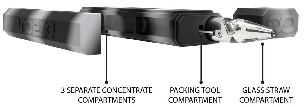 The Dabout container features three separate compartments for your concentrates. The Dabout also comes with a pyrex glass straw and a packing tool. It's basically a dugout for concentrates. Pyrex is great for low temperatures.